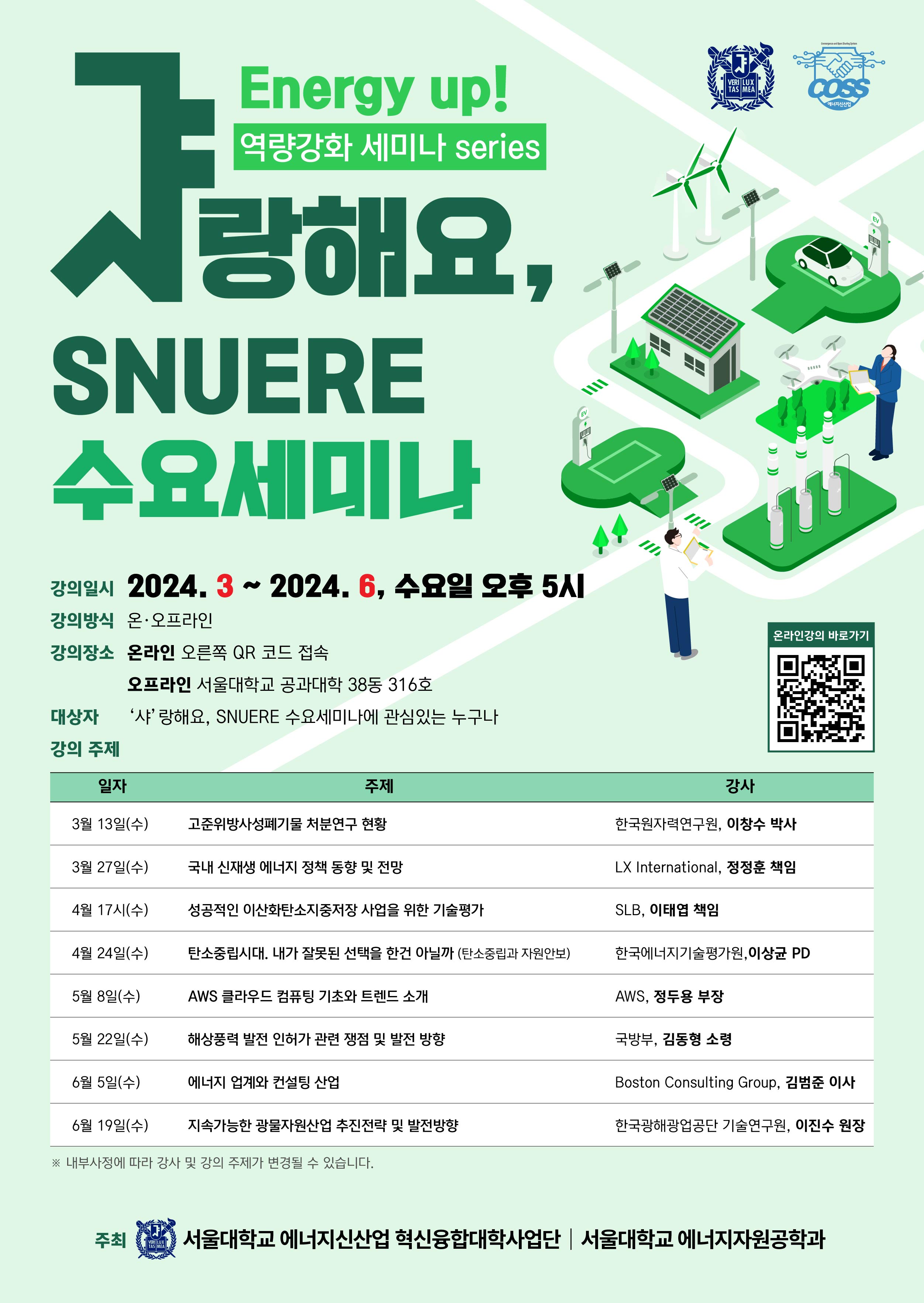 관심있는 동문들은 우측중앙에 있는 QR코드를 통해서 간편하게 줌으로 "수요세미나"에 참여가능합니다.
