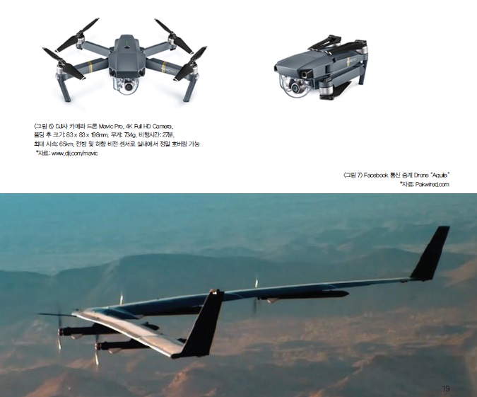 라 드론 Mavic Pro(그림 6)를 1000만원대 제품으로 선보이며 3kg이상의 기존의 중형 멀티콥터 카메라 드론 제품을 빠르게 대체하고 있다. 2016년 6월 페이스북은 세계 오지의 18~27km 상공에 3개월 이상 띄워 인터넷 통신을 제공하기 위해 개발 중인 드론 `아퀼라`(그림 7)의 96분간 첫 시험 비행을 공개했다. 그러나 2016년 12월 시험 비행에서 추락하여 연구 개발 과정의 첫 시련을 격고 있으며 문제 해결 노력을 하고 있다.
