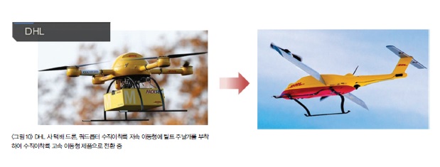 독일의 글로벌 물류 기업 DHL은 2013년부터 아마존보다 빠르게 택배 드론 연구를 시작하여 12km 거리의 도시 지역에 의약품을 배달을 성공시키면서 주목을 받고 있다. 쿼드콥터를 강풍 환경에서 택배 서비스를 할 수 있는 쿼드콥터 형태로 형상 개조를 하여 최대 시속 68km 까지 성능을 높였다. 후속 모델로 악천후 환경에서도 안정적으로 서비스를 하기 위하여 수직이착륙과 고속이동 기능이 가능한 틸트 윙 부착형 드론 기종을 개발하고 있다.