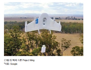 2014년에 선보인 구글 사의 Project Wing(그림 8)은 날개 부착형 수직이착륙 고속이동 드론으로 멀리 떨어진 오지라도 쉽고 빠르게 택배를 보낼 수 있는 데 착륙이 쉽지 않아 배달 장소에서 외이어 하강 장치로 물건을 배달하는 개념이다. 2016년 10월 프로젝트 윙 프로그램을 맡아온 Dave Vos가 구글을 떠나며 새로운 국면에 직면해 있다. 트론 택배 계획 발표로 회사 홍보 효과를 가장 크게 본 아마존 사가 첫 번째 드론 택배 서비스를 2016년 12월 영국 캠브리지에서 하였다. 이전에 공개한 것과 다른 형태의 프라임 에어 쿼드콥터 드론으로 13분만에 소비자에게 물건을 배송하였는데, 비행 배송 범위는 24km이고, 최고 속도는 시속 88km 정도이며 최대 2.3kg의 화물을 수송할 수 있다. 아마존 사는 후속 모델로 전통적인 쿼드콥터 드론에 날개와 추진 프로펠라를 부착하여 강풍 환경에서 더 빠른 배송을 위한 드론과 무인자동차와 협업할 수 있는 배달 시스템 연구 개발에 박차를 하고 있다.