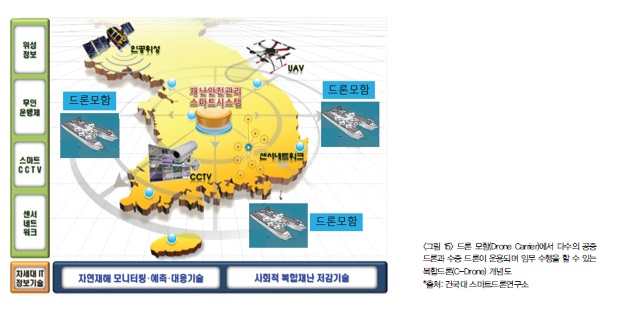 신개념 한국형 드론 제품 확보 후, 국방과 국가 재난안전 관리 임무수행을 염두해 둔 드론 모함 개념의 한국형 복합 드론(그림 14)도 제안해 본다. 다수의 공중 드론과 수중 드론을 탑재한 민군 겸용 드론모함을 서해, 남해, 동헤 중요 해안가나 대형 댐 내수면에 배치하고 민간용의 경우, 평상시에는 환경 감시 모니터링, 대기 및 수질 자료 수집 등의 임무를 수행하다가 재난 위급 상황이 발생할 경우 신속한 정보를 수집하여 확실한 대처 방안을 결정한 후, 즉각적으로 대응을 할 수 있는 3A3F (Anytime /Anywhere /Any-Disaster /Fast Sense /Fast Decision /Fast Reaction) 시스템의 구축과 운용 방안을 그림 15와 같이 제안해 본다. 내륙 지역 재난에 대비하여 전국 중요 거점(소방서, 경찰서, 중요 통신 중계소 등)에 다수의 공중 드론과 지상 드론을 배치하고, 해양 지역에 드론 모함을 배치하여 한국형 재난안전 관리 시스템을 구축하여 운영하자는 것이다. 필요 시 실무자부터 국가 최고 통수권자까지 통신 정보망을 통하여 상황 발생 지역의 필요한 정보를 공유하면서 현장 상황에 가장 적합한 대처 방안을 채택하고 신속하게 대응할 수 있는 재난안전 관리 시스템과 그 운용 방안을 구축하자는 것이다.