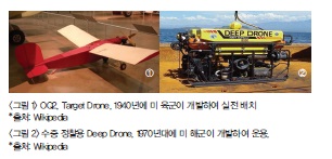 지난 70년간 무인비행체, 무인잠수정, 무인 선박, 무인차량 등이 간헐적으로“드론(drone)”이란 별칭으로 불리어 왔으나 요즈음 멀티콥터 드론(4개 이상의 프로펠러로 구성)이 레저용과 사진 촬영용으로 활성화 되며 대중의 관심이 폭발적으로 늘고 있다. 드론(drone)은 원래 윙윙 거리를 내며 날아다니는 수벌을 칭하는 영어 단어명인 데, 1940년대에 미국에서 대공포 훈련용으로 개발된 무인항공기 “OQ2”(그림 1)를 타겟 드론(target drone)이라고 명명하며 드론이라는 용어가 쓰이기 시작하였다. 그 후 고정익항공기 드론 형상으로 개발되어 군의 정찰/감시 임무를 수행하여 왔고 현재는 미사일발사 등 공격 임무도 수행하는 기종도 있다. 미국에서 1970년대에ROV(Remotely Operated Vehicle)“Deep Drone”(그림 2)이 수중드론으로 개발되어 심해 구조 및 인양용으로w 활용되었다. 1984년 대한항공 007기가 사할린 바다 상공에서 소련 수호이 전투기의 미사일 피격을 받아 바다에 추락했을 때 그 잔해를 수색하기 위하여 Deep Drone이 투입된 적이 있다.