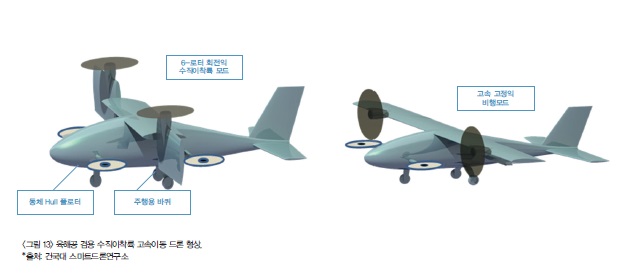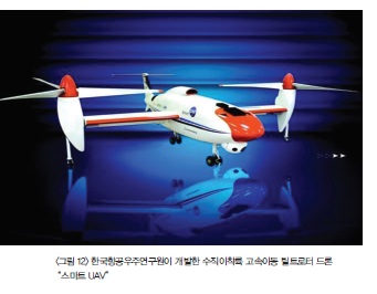 전 세계적으로 민수용 소형드론 시장이 급격히 팽창되고 있는 상황에서 국산 드론이 국제 경쟁력을 가지려면, 미래 시장을 선도할 신개념 드론 비즈니스 모델을 잘 발굴하고 관련 서비스 시스템과 원천 핵심기술의 확보가 중요하다. 현재 저가 보급형으로 널리 판매되고 있는 중국산 영상 촬영용 멀티콥터의 성능을 분석해 보면 풍속이 초당 10m 이상의 강풍 환경에서 안정된 안정적인 비행이 어렵다는 점인 데 이 문제를 극복할 수 있는 국산 드론 제품 개발이 시급한 실정이다. 악천후 환경에서 운용이 가능한 한국형 드론 제품이 제공된다면 경찰이나 소방대원 등 전문가 특수 임무 수행에 크게 도움이 될 것이다. 이러한 신개념 고성능 드론에 대한 요구를 해소하기 위하여 건국대 스마트드론연구소는 수직이착륙 고속이동 드론(그림 13)에 대한 연구 개발을 지난 10여년간 수행하였다. 국내 고유 디자인 기반의“다단 틸트 Flying Car”드론 시스템이 2017년 미국 특허 등록되어 제품 개발 단계에 있다. 주날개를 부착하여 고속이동 기능과 내풍성을 높일 수 있는 신개념 형상에 신소재를 활용한 초경량 구조물을 적용하고, 초소형/초경량 비행제어 컴퓨터, IoT 네트워크 개념의 드론 운용 시스템을 구성하여 최고 수준 설능의 신개념 공중 드론이 되도록 노력하고 있다.