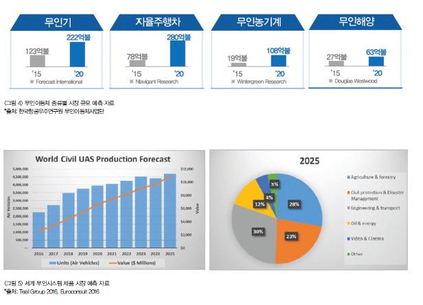드론 관련 세계 시장(그림 4, 5)을 보면, 공중 드론은 2015년 123억불에서 2020년 222억불로, 자율주행 드론은 78억불에서 280억불로, 농업용 드론은 19억불에서 108억불로, 해양용 드론은 27억불에서 63억불로, 연평균 22% 성장이 예상된다.