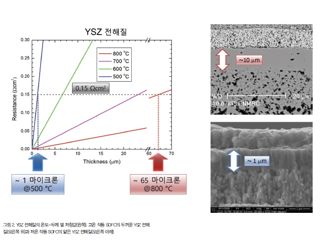 이와 같은 미세구조 변화의 대표적인 방법은, 전해질의 경우 전해질 두께를 감소시켜 저항을 감소시킴으로써 저온에서 이온전도도 저하를 상쇄하는 것이고 전극의 경우 나노(nm) 구조화하여 표면적과 그에 따른 전극반응면적을 증가시켜 저온에서 감소하는 촉매 활성을 상쇄하는 것이다. 일례로, 그림 2에 보인 것처럼 SOFC의 대표적인 전해질 물질인 이트리아 안정화 지르코니아 (Y2O3-stabilized ZrO2, YSZ)의 경우, 전해질 물질로 사용할 수 있는 적절한 면저항인 0.15 Ωcm2 이하를 얻으려면 800 °C에서는 약 65 마이크론 두께 이하, 500 °C로 온도를 저하시키는 경우 1 마이크론 두께 이하면 만족되는 것을 알 수가 있다.