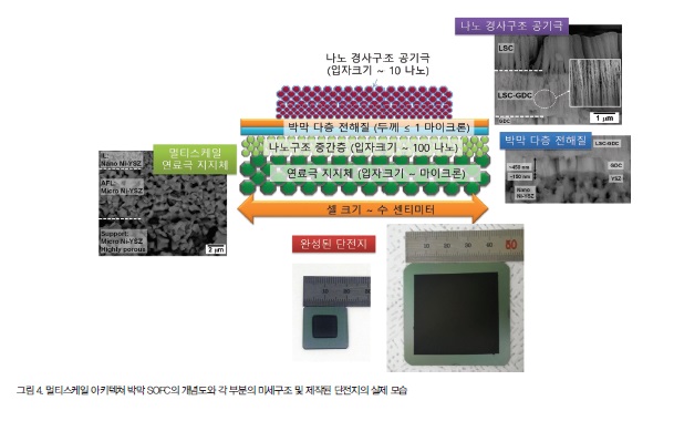 멀티스케일 아키텍쳐 박막 SOFC의 구성소재는 검증된 SOFC 소재로서, 기존의 SOFC와 동일한 플랫폼과 소재를 사용하되, 전해질의 두께와 전극의 미세구조 규모를 나노~마이크론 규모로 축소하여 성능의 손실 없이 SOFC의 작동온도를 획기적으로 낮추는 기술이다. 기존의 SOFC에 비해서 600 °C 이하 온도에서 3~4배 이상의 출력밀도 향상을 얻었고, 온도의 급격한 변화와 장기 작동에서 박막 SOFC 기술로서는 획기적으로 향상된 안정성을 보였다. 멀티스케일 아키텍쳐 박막 SOFC는 재현성이 뛰어난 박막 기술의 특성을 살려 저온 구동형 SOFC를 신뢰성있게 연속적으로 제작할 수 있는 장점이 있고, 면적이 제한되는 후면식각 멤브레인과 달리 구조적 견고성을 가지므로 제작 면적에 제한을 받지 않아 적합한 증착장비를 활용하면 대면적 박막 SOFC 제작도 가능하다 [8].