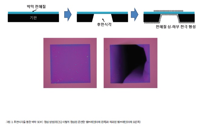 박막 전해질을 형성하는 가장 일반적인 방법은 실리콘이나 유리 기판처럼 치밀한 기판 위에 전해질 박막을 증착한 후, 후면식각을 통해 박막 전해질의 하부를 노출시키고 이후 전극을 전해질의 상-하면에 형성시키는 것이다(그림 3). 이 방법이 가장 많이 이용되고 있는 데는 몇 가지 이유가 있다. 연료전지에서 연료극의 연료와 공기극의 공기가 전해질을 통과하여 직접 섞이게 되면 전기화학반응을 일으키지 않고 연료의 직접 연소가 일어나게 되어 전기가 얻어지지 않을 뿐 아니라 연소열로 인해 구조가 파괴되므로, 전해질은 연료와 공기가 섞일 수 없는 치밀한 구조를 지녀야 한다. 그런데, 박막증착법으로 형성되는 박막의 구조는 증착되는 표면의 구조를 반영한다. 즉, 박막 증착법을 이용하여 치밀한 박막을 형성하기 위해서는 치밀한 증착 표면이 요구되므로 실리콘 웨이퍼와 같은 치밀하고 평평한 기판을 사용하는 것이 가장 간단하고 명확한 접근 방법이다. 이렇게 치밀한 전해질을 형성한 후, 연료전지로서의 작동을 위해 전해질의 양면에 연료와 산소 기체가 도달할 수 있어야 하므로, 전해질의 아랫면(기판과 닿는 면)은 후면 식각을 통해 기판을 제거하여 반응 기체가 도달할 수 있는 통로를 형성해 주어야 한다. 이후전극 증착을 거쳐 박막기반 SOFC가 완성된다.