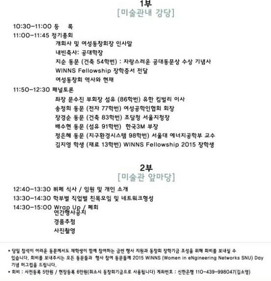 올해는 정기총회+신입회원 환영회+멘토링데이를 하루에 모아 진행하고자합니다. 여러분들의 관심과 애정을 기다립니다.2016 WINNS (Women in eNgineering Network SNU) Day -정기총회 및 멘토링 "2016 서울대학교 여성공학인 네트워크의 날“식 순1. 일 시 : 2016/11/05 토요일 10:30- 15:002. 장소 : ...